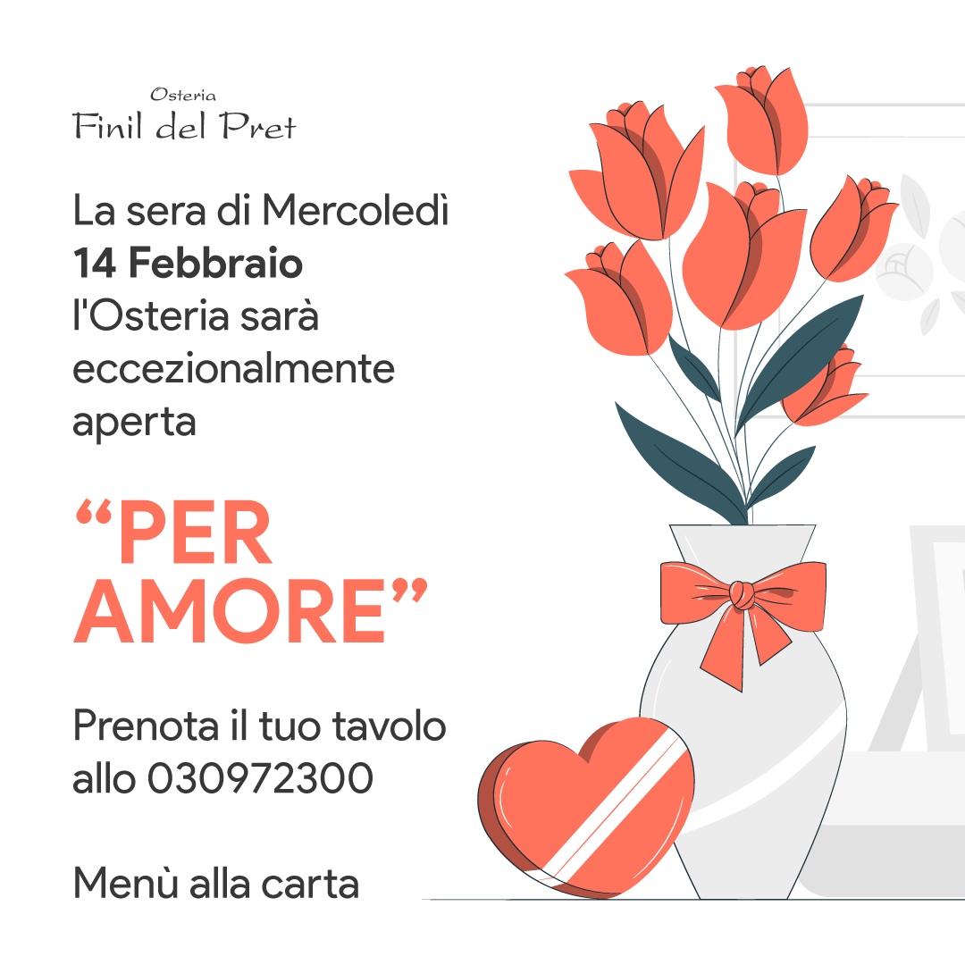 SAN VALENTINO 2024 di Finil del Pret18 Gennaio 202418 Gennaio 2024Ricorrenze MERCOLEDI’ 14 FEBBRAIO 2024 L’Osteria resterà eccezionalmente aperta per il servizio della cena! Ci dedicheremo agli innamorati! Menù alla carta Info e prenotazioni 030972300