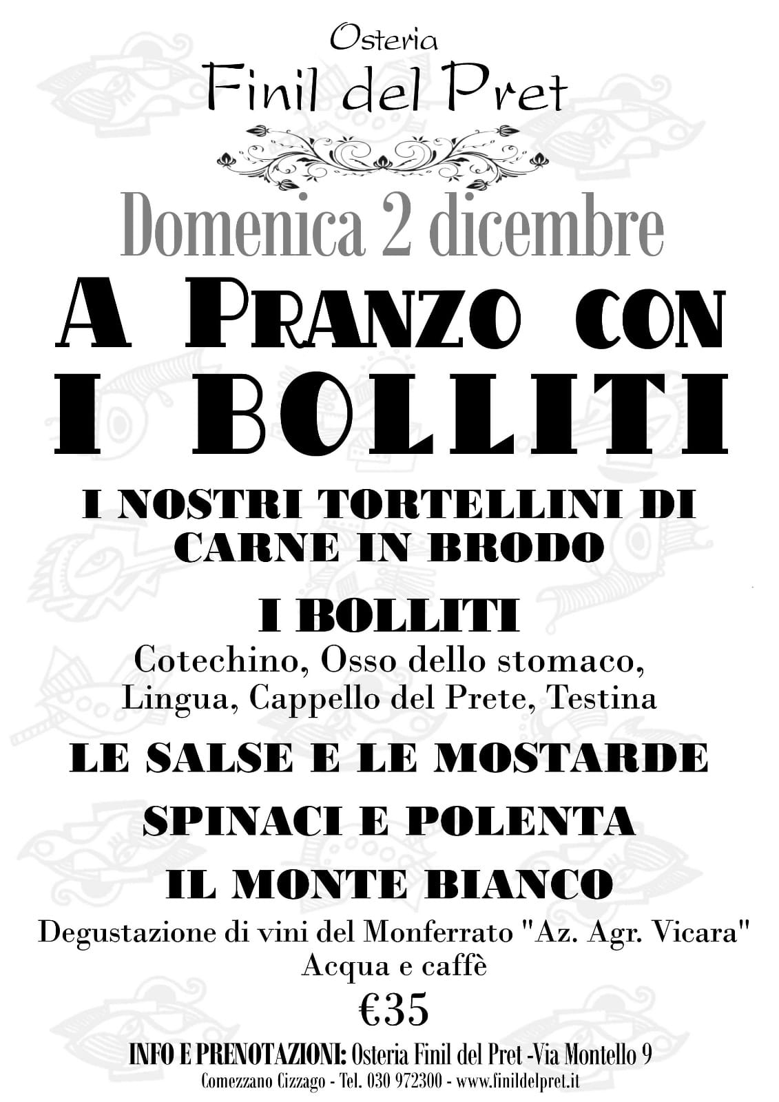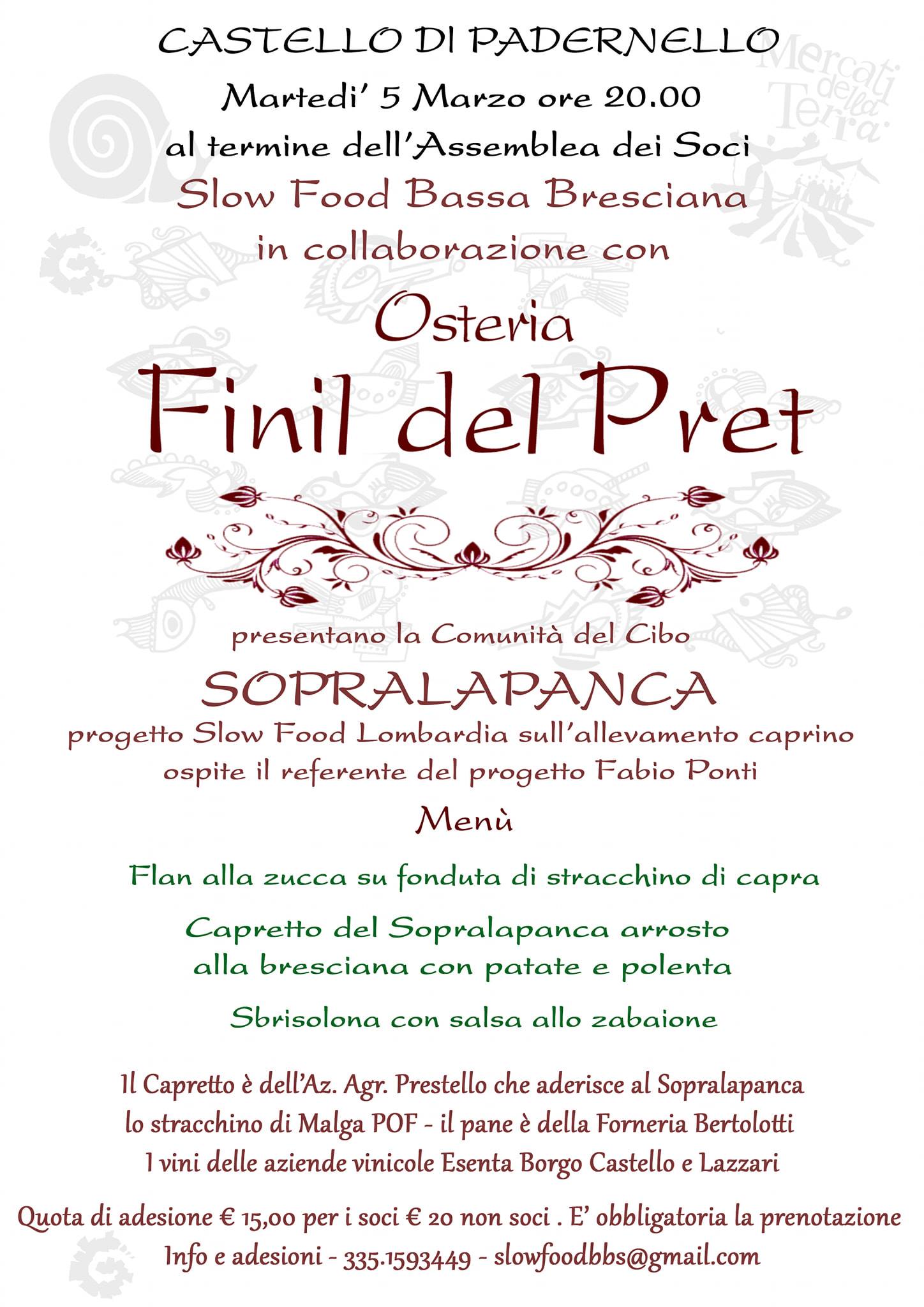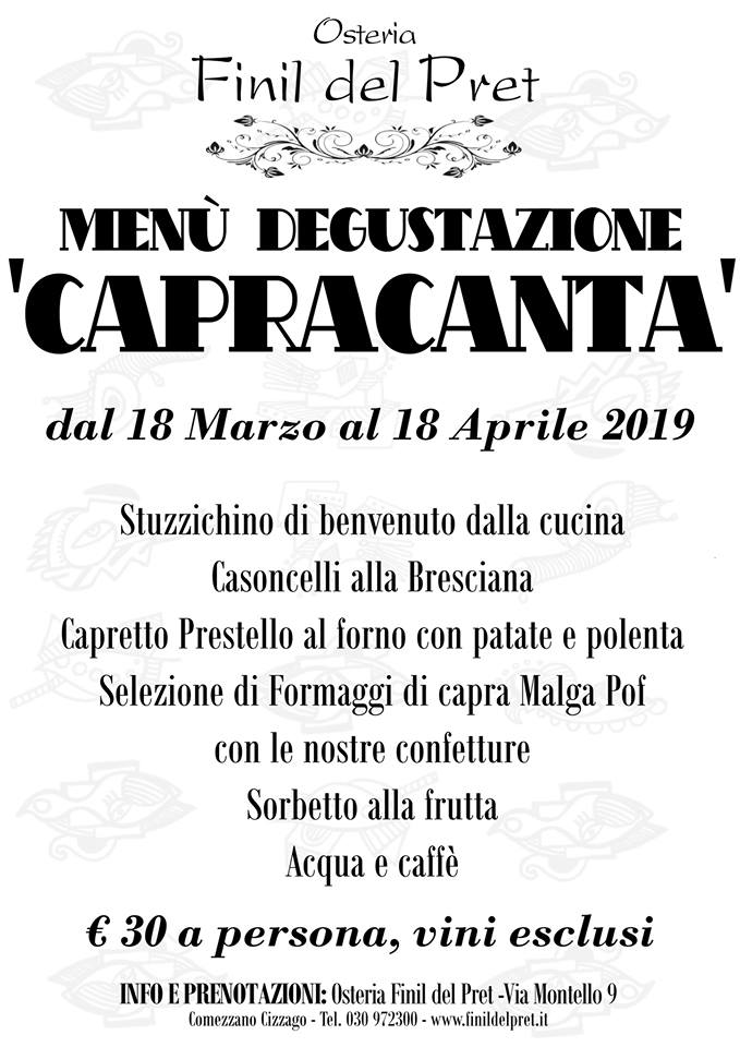 DAL 18 MARZO AL 18 APRILE MENU DEGUSTAZIONE “CAPRACANTA” Stuzzichino di benvenuto dalla cucina Casoncelli alla bresciana Capretto PRESTELLO al forno con patate e polenta Selezione di formaggi di capra MALGA POF con le nostre confetture Sorbetto alla frutta Acqua e caffè € 30 a persona (vini esclusi)