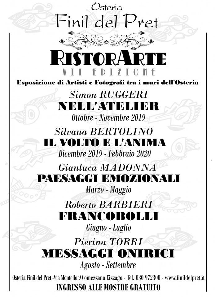 TORNA RISTORarte, il progetto del Finil del Pret per valorizzare l’arte appassionata e sconosciuta del territorio… SIMON RUGGERI SILVANA BERTOLINO GIANLUCA MADONNA ROBERTO BARBIERI PIERINA TORRI Saranno i protagonisti di questa SETTIMA EDIZIONE!! VI ASPETTIAMO!!!