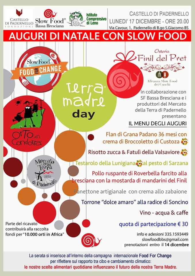 Lunedì 17 Dicembre vi aspettiamo al Castello di Padernello Preparemo un menù con i prodotti del Mercato della Terra PRENOTAZIONI PER LA CENA ENTRO E NON OLTRE IL 14 Dicembre Contatti: 030/972300