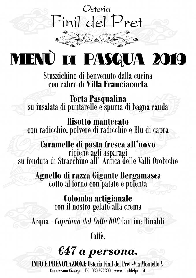 Stuzzichino di benvenuto dalla cucina con calice di Villa Franciacorta *** Torta Pasqualina su insalata di puntarelle e spuma di bagna cauda *** Risotto mantecato con radicchio, polvere di radicchio e Blu di capra *** Caramelle di pasta fresca all’uovo ripiene agli asparagi, su fonduta di Stracchino all’Antica delle Valli Orobiche *** Agnello di razza […]