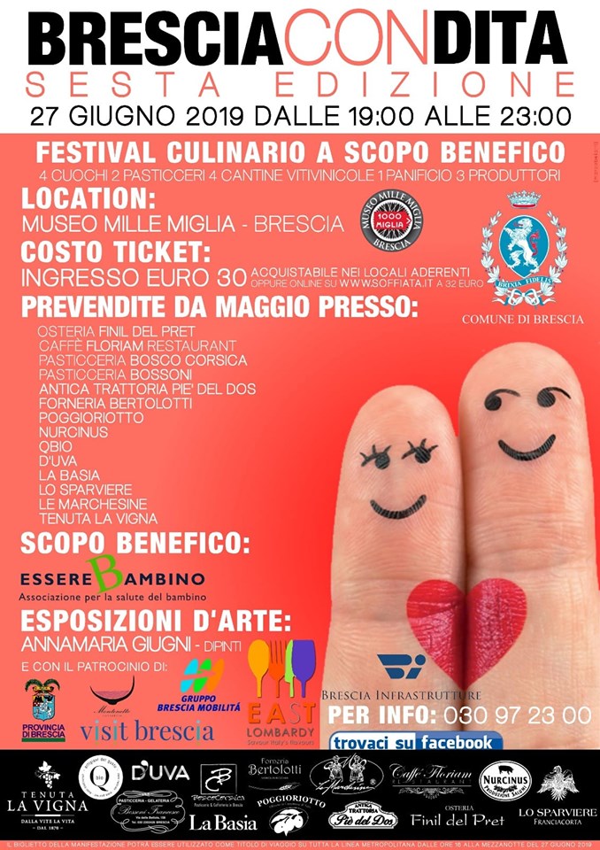 IL 27 GIUGNO 2019 torna BRESCIAconDITA. Alla VI EDIZIONE anche noi vi aspettiamo al MUSEO MILLE MIGLIA per una serata all’insegna del BUON CIBO, della BUONA MUSICA, dell’ARTE e della BENEFICENZA (Associazione Essere Bambino). PRESTO TUTTI I DETTAGLI INFO 030 /972300